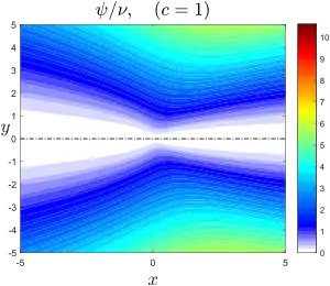 est reliée à la fonction de courant par . Ses contours se confondent donc avec celles-ci. Cette solution décrit l'écoulement entraîné en amont écarté de l'axe par la source dont l'intensité est donnée par la constante c qui s'interprète en termes de force volumique axiale[4]. Le « bord » du jet peut être défini par le point où les lignes de courant sont le plus près de l'axe, soit