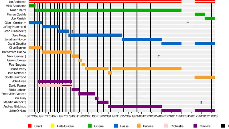 - Ian Anderson : chant, flûte traversière, guitare acoustique, basse, bouzouki, mandoline, saxophone, harmonica, claviers (1967-2012, depuis 2017)