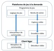 Le programme du jeu peut se décomposer en deux composants majeurs : la logique de jeux qui est responsable de convertir les commandes du joueur en interaction dans le jeu, et le rendu de scène du jeu qui génère les scènes en temps réel. Ces deux composants sont capturés en vidéo par le composant responsable de la capture vidéo (en anglais : video capturer) qui est ensuite compressée par l'encodeur vidéo pour être envoyée au client léger [1].