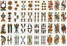 - au nord, les cartes utilisent les enseignes italiennes : coupes, bâtons, deniers et épées[2] ;