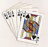 | La probabilité d'obtenir la Quinte flush royale est de 0,008 (pour un jeu de 32 cartes). |