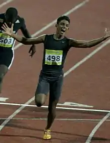 Shehan Ambeypitiya, sprinter srilankais, remportant la médaille d'or au 100 m aux Jeux de la jeunesse du Commonwealth, à Pune en 2008