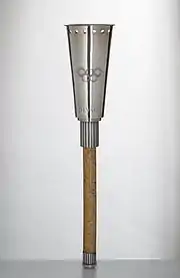 La torche olympique[5] est de forme conique et le manche est en bois laqué.