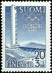 L'emblème des Jeux de 1952[3] représente la tour du Stade olympique d'Helsinki avec au sommet les anneaux olympiques.