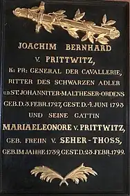La tombe du général von Prittwitz et de son épouse Maria Eleonore dans l'ancienne église patronale de l'actuel Neuhardenberg, remodelée par Karl Friedrich Schinkel en 1815/1817, est conservée. Dans le sol du sanctuaire se trouve une pierre tombale en fonte avec des lettres dorées, qui commémore le couple Prittwitz.