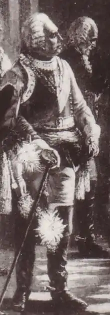 Lieutenant-général von Prittwitz (sous le lustre) sur le lit de mort de Frédéric le Grand (lithographie de Georg Schöbel (de))