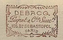 | 1868-1899 | Debacq & Cie | Sinice Debacq | Camille Batcave, Victor Peyret | idem jusque vers 1895 puis 105 boulevard Sébastopol (IIe arr.) |