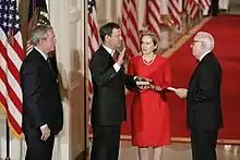 Prestation de serment devant le président Bush, son épouse Jane Roberts et le juge John-Paul Stevens dans l'East Room à la Maison Blanche.