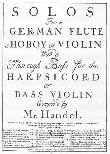 Dans l'édition de 1732 des sonates de Haendel pour instruments solos la page de couverture indiquait : « Printed and Sold by John Walsh at the Harp and Hoboy in Catherine Street in the Strand ». Elle énumérait aussi d'autres ouvrages de Haendel publiés par Walsh, ainsi que leur prix.