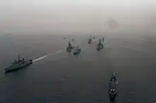 Les navires du groupe de travail 100.1 participent à l'exercice OTAN BALTOPS en octobre 1985. En tête se trouvent les frégates ouest-allemandes Rheinland-Pfalz (F 209), à gauche, et Augsbourg (F 222), à droite, suivies du destroyer ouest-allemand Mölders (D 186), le destroyer britannique HMS Liverpool (D 92), le cuirassé de la marine américaine USS Iowa (BB-61) et le croiseur lance-missiles USS Ticonderoga (CG-47).