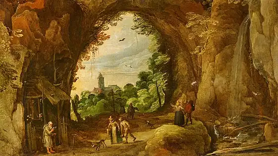Paysage de montagne avec des pèlerins dans une chapelle de la grotte, c. 1616, musée Liechtenstein, Vienne.