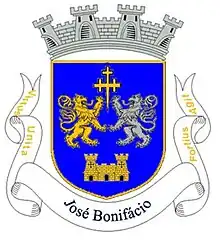 Description héraldique : sur un champ d'azur, enfilé d'or, au cœur, deux lions rampants au combat, l'un d'argent et l'autre d'or, représentant les luttes menées par les minorités dans la construction et les conquêtes de leur identité. Dans la tête, séparant les lions, tout en étant élevée dans la gloire, une Croix de Lorraine d'or, symbole des minorités fidèles à la vérité et à la justice, qui au moment de l'abandon général (principalement par la Préfecture régionale d'Itaquera à qui il est toujours politiquement subordonné, ainsi que la mairie de São Paulo, qui refuse d'installer la mairie régionale de José Bonifácio, alléguant l'impossibilité en raison de problèmes financiers et d'occupation des terres et d'autres facteurs[5]), ils s'accrochent à leur foi et fixent sur une épopée de résistance et de dépassement. Ils traversent d'innombrables obstacles et épreuves, sans ressources humaines d'aucune sorte, mais avec foi en la Providence, qui à la fin de la bataille, les glorifie avec la victoire, qui au début et pour les incroyants, apparaissait comme humainement irréalisable. En contre-bosse, un château clos, d'or, représentant les bâtiments du plus grand ensemble immobilier des Amériques. Au-dessus des armoiries, une couronne murale d'argent avec 4 tours, représentant le statut de José Bonifácio en tant que district. Dans un listel d'argent, libre sur l'écu, la légende « Virtus Unita Fortius Agit » (L'union fait la force) est inscrite aux extrémités, en bleu. Et au Centre, également d'azur la légende José Bonifácio[6],[7].