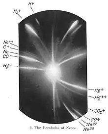 En 1912, il étudie la composition des mélanges des ions positifs dits « ions anodiques ». Au cours de cette recherche, il mesure la déflexion d'un faisceau de néon ionisé (Ne+) qui passe à travers un champ magnétique ainsi qu'un champ électrique. Sur la plaque photographique qui lui sert comme détecteur, il observe deux taches (voir image) qui correspondent aux atomes de masses 20 et 22. Il conclut que le néon est constitué d'atomes de deux masses différentes ou isotopes.