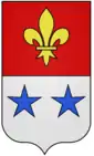 Blason : coupé en 1er de gueules à la fleur de lys d'or et en 2e d'argent aux deux étoiles d'azur[18].