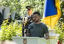 Juste avant le défilé, le président Volodymyr Zelensky s'adresse à la foule, appelant à renforcer les relations de l'Ukraine avec d'anciens pays soviétiques, les nations européennes et l'OTAN[26].
