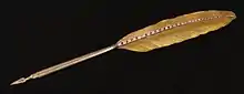 La plume de l'abolition est la plume avec laquelle la princesse impériale Isabelle a été signée la Loi d'or en 1888, mettant ainsi fin à la légalité de l'esclavage au Brésil[4]. Financée par la population quand il a été su que le projet serait adopté par l'Assemblée générale, elle est entièrement faite en or 18 carats et ornée de 27 diamants et 25 rubis. Comme accompagnement, un écrin précieux portait l'inscription « A Dona Isabel, a Redentora, o povo agradecido » (À Dona Isabelle, la Rédemptrice, le peuple reconnaissant) avec le numéro 3353 (le numéro de la loi impériale). Cette plume n'a servi qu'une seule fois, pour signer effectivement la Loi d'or au Palais impérial[14]. Restée possession de la famille de Bragance jusqu'en 2006, elle a finalement été vendue au Musée impérial du Brésil de Petrópolis pour 500,000 réals[15].