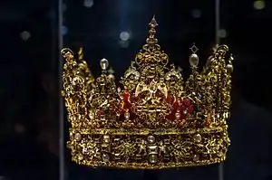 La couronne est le signe visible du pouvoir royal et a été fabriquée par l'orfèvre royal Paul Kurtz à Copenhague dans les années 1670–1671. En tant que couronne du premier monarque absolu, elle a été faite comme une couronne fermée pour avoir un aspect différent des couronnes ouvertes des rois élus, peut-être inspirée de la couronne impériale de Charlemagne[9].
