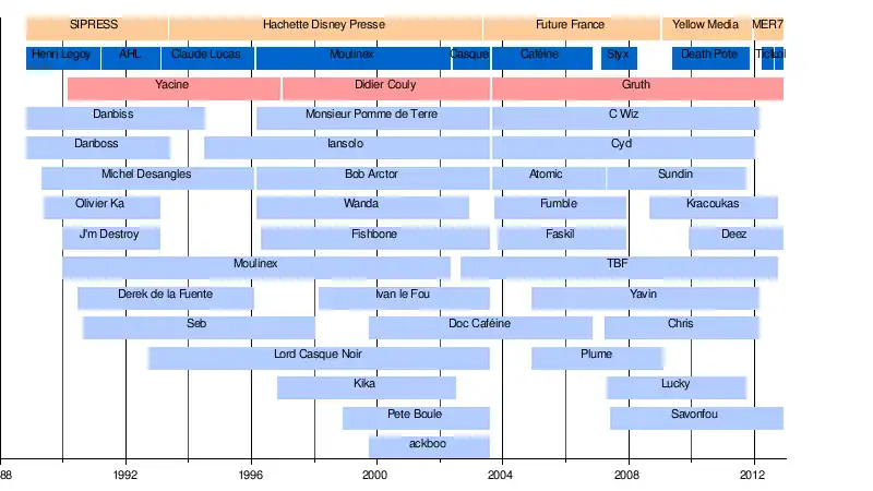 En orange, les propriétaires ; en bleu marine : les rédacteurs en chef ; en rouge : les illustrateurs ; en bleu clair : les rédacteurs y ayant travaillé au moins trois ans.