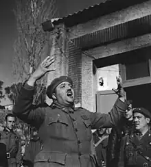 « Catalans ! Il y a peu de temps, la glorieuse armée espagnole a commencé à entrer dans la ville de Barcelone. Celle-ci ayant à présent été prise dans sa totalité, les forces défilent tranquillement dans les rues en soulevant un indescriptible enthousiasme. La multitude acclame les soldats. Citoyens, décorez vos balcons ! En premier lieu, je dirai à vous Barcelonais, à vous Catalans, que je vous sais gré de toute mon âme de l’accueil enthousiaste que vous avez fait à nos Forces armées. Je dis aussi aux autres Espagnols que c’était une grande erreur que la Catalogne ait été séparatiste, qu’elle ait été anti-espagnole. Je dois dire qu’ils nous ont fait l’accueil le plus enthousiaste que j’aie vu ! [...] J’ai assisté à la conquête des quatre provinces du Nord ; j’ai promené le Drapeau national et l’écusson de Navarre à travers l’Aragon, à Castellón, de toutes parts, et en aucun endroit, vous dis-je, en aucun endroit on nous a accueillis avec autant d’enthousiasme et de cordialité qu’à Barcelone[12],[13]. »