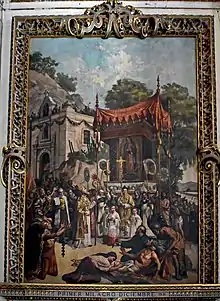 Selon la tradition, un premier oratoire est construit en , au pied de la colline de Tepeyac, sur le lieu réputé être celui de la 3e apparition de la Vierge de Guadalupe. Accolé à cet petit oratoire (qui accueille l'image de Notre-Dame de Guadalupe, un petit ermitage est construit, occupé par saint Juan Diego qui gère le lieu et accueille les pèlerins. Fin , l'évêque Mgr Zumárraga préside une grande procession officielle pour aller installer la précieuse relique dans sa nouvelle chapelle[23]. Cet événement a donné lieu à la réalisation d'une peinture monumentale installée dans la grande église du sanctuaire en 1895.