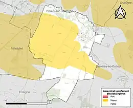Les mouvements de terrains susceptibles de se produire sur la commune sont des tassements différentiels[17]. Le retrait-gonflement des sols argileux est susceptible d'engendrer des dommages importants aux bâtiments en cas d’alternance de périodes de sécheresse et de pluie[18]. 55,2 % de la superficie communale est en aléa moyen ou fort (54,9 % au niveau départemental et 48,5 % au niveau national)[Carte 2]. Depuis le , en application de la loi ELAN, différentes contraintes s'imposent aux vendeurs, maîtres d'ouvrages ou constructeurs de biens situés dans une zone classée en aléa moyen ou fort[Note 2],[19].