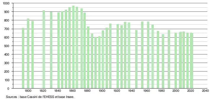 L'évolution du nombre d'habitants est connue à travers les recensements de la population effectués dans la commune depuis 1793. Pour les communes de moins de 10 000 habitants, une enquête de recensement portant sur toute la population est réalisée tous les cinq ans, les populations légales des années intermédiaires étant quant à elles estimées par interpolation ou extrapolation[27]. Pour la commune, le premier recensement exhaustif entrant dans le cadre du nouveau dispositif a été réalisé en 2005[28].