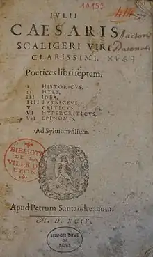 - Poetices libri VII, Lyon, 1561, ouvrage plein d'érudition, où il traite de l'origine et du but de la poésie et passe en revue les poètes les plus célèbres. Les titres des livres sont les suivants : I HISTORICVS - II HYLE - III IDEA - IIII PARASCEVE - V CRITICVS - VI HYPERCRITICVS - VII EPINOMIS;