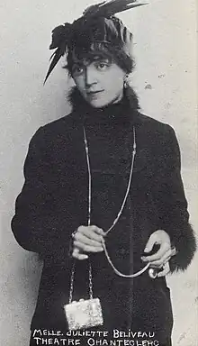 Née de l'union d'Élodie Prince et d'Henri Béliveau, Juliette Béliveau ne grandit pas exclusivement à Nicolet. En 1891, sa famille s'installe à Boston, aux États-Unis, pendant une période de deux ans[1]. Ils reviennent ensuite à Nicolet avant de déménager de manière définitive à Montréal[1]. En 1899, à dix ans, Juliette Béliveau commence sa carrière de comédienne au Monument-National dans La Meunière, une œuvre présentée dans le cadre de la programmation des Soirées en famille d'Elzéar Roy[1],[2]. Jusqu'en 1907, Juliette Béliveau interprète des rôles d'enfants sur les scènes de différents théâtres[3]. Elle participe notamment à des productions du Monument-National, du Théâtre des nouveautés à Montréal et aux Soirées du Conservatoire de Lassalle[4]. Durant sa jeunesse, elle joue tous les classiques auprès des grands noms de la scène française et fait de la tournée au Québec. À l'adolescence, se rendant compte qu'elle ne grandira plus, elle renonce - non sans amertume - à la carrière de tragédienne à laquelle elle aspirait, afin de se spécialiser dans le répertoire des variétés et du burlesque, des comédies légères, des revues, etc.