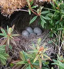 Cet oiseau au comportement territorial pendant la saison de nidification peut se nourrir en petits groupes en hiver. Les cris d'appel sont tsik ou tchet ou encore de doux trill quand l'oiseau est en vol. Le chant est constitué de trilles au son métallique émises sur le même ton[1].