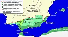 L'expédition la plus occidentale menée sous le règne de Justinien est l'envoi de troupes en Espagne. Cette ancienne province romaine est alors le lieu d'implantation du royaume wisigoth, dirigé par Theudis au début du règne de Justinien. Dans le cadre de la guerre des Vandales, il refuse de soutenir Gélimer, mais il s'empare de la forteresse de Septem (Ceuta), sur la côte africaine du détroit de Gibraltar. Toutefois, dès 534, Bélisaire la récupère et les Byzantins la conservent en dépit du siège des Wisigoths en 547. Justinien profite ensuite de troubles internes au royaume pour intervenir. Le nouveau roi, Agila Ier, est alors en butte à la révolte d'Athanagilde Ier qui demande le soutien de l'Empire byzantin. L'empereur envoie alors le patrice Libérius vers 552, pourtant âgé de plus de quatre-vingt ans, ce qui semble indiquer que Justinien n'espère pas reconquérir l'ensemble de la péninsule ibérique. Grâce à cette aide, Athanagilde parvient à vaincre son adversaire et à s'installer sur le trône, tandis que les Byzantins en profitent pour s'emparer d'une région correspondant peu ou prou à l'Andalousie, comprenant les villes de Carthagène, Malaga ou Cordoue, le tout au prix d'un faible investissement en hommes et en argent[132],[134],[135]. Toutefois, après l'arrivée au pouvoir d'Athanagilde, les Byzantins ne parviennent pas à poursuivre leur progression. Avec la mort de Justinien, cette tentative partielle de constituer une tête de pont en Espagne s'évanouit progressivement. Les dernières possessions impériales dans la région semblent disparaître vers 624, non sans avoir influencé, à un degré limité, certaines pratiques du royaume wisigoth, comme la proximité entre l'Église et l'État, ainsi que la vie culturelle locale (Martin de Braga maîtrise ainsi très bien le grec)[136],[137],[138],[139].