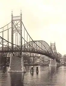 La reconstruction du pont de 140,30 m de portée et d'environ 400 t reposait sur un concept de pont à haubans, portant une voie de 5 m de largeur utile. Ses pylônes de 32 m, prévus pour supporter des tabliers de 48,3 m et 92 m[7] respectivement, avaient une forme de H ; mais pour des raisons de résistance (la géométrie initiale offrait une prise excessive au vent) , il fallut re-profiler les pylônes en forme de A. Cette modification s'accompagna d'un surcoût de 770 000 euros, portant le montant total du projet à 4 millions d'euros[8]. L'investissement a été pris en charge à 75 % par l'Union Européenne (Fonds de Développement régionaux), à 16,67 % par le Land de Berlin et à 8,22 % par la République Fédérale d'Allemagne.