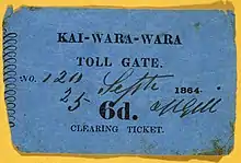 Un péage fut établi au niveau de Kaiwarra par le Hutt County Council. Il concernait tous les véhicules et le trafic entrant ou sortant de Wellington et constituait une rentrée substantielle pour la maintenance des routes. Le comté allant du détroit de Cook jusqu’à Waikanae et la chaîne de Rimutaka (en), l’argent était dépensé en remise en état des routes, ce qui donnait peu ou pas de bénéfices pour les habitants de Wellington. Le péage fut retiré quand la ville de Kaiwarra rejoignit le borough de Onslow en 1890. Le Comté de Hutt installa de nouvelles portes de péage sur la route de Hutt Road et des gorges de Ngauranga (en)[4].