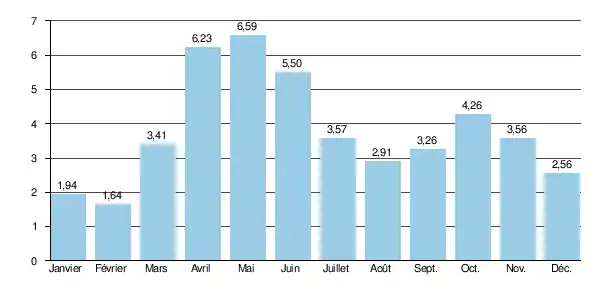 Le débit moyen mensuel observé en février (minimum d'étiage) est de 1,64 m3/s, soit plus ou moins 25 % du débit moyen du mois de mai (6,59 m3/s), ce qui témoigne de l'amplitude très faible des variations saisonnières. Sur la durée d'observation de 15 ans, le débit mensuel minimal a été de 0,75 m3/s en , tandis que le débit mensuel maximal s'élevait à 9,39 m3/s en .