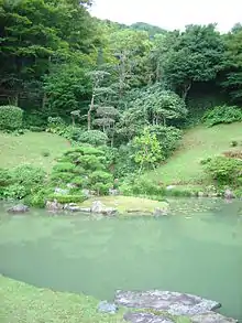 Le jardin du Kannon-in est un exemple de jardin japonais de l'époque d'Edo du style chisenkanshō-shiki teien (池泉観賞式庭園)[3], qui signifie littéralement un jardin du « style d'appréciation d'étang ». Un jardin chisenkanshō-shiki est destiné à être contemplé à partir d'un point de vue fixe en un seul endroit, plutôt que parcouru et observé sous plusieurs angles[7]. Dans le cas du Kannon-in, le jardin est vu à partir de la véranda du sho-in (書院), bâtiment consacré à l'étude des sūtras bouddhistes. Les travaux du jardin commencent en 1650 et se prolongent dix ans. Le jardin utilise la pente douce du paysage du Kannon-in. On trouve une description du jardin dans le Kannon-in ezu (観音院絵図), avec une illustration du Kannon-in, publiée dans le Mudaaruki (無駄安留記) en 1858. Le Mudaaruki est probablement basé sur des œuvres plus anciennes[8]. La structure annexe (bekkan (別館)) se trouve dans le Mudaaruki à un emplacement légèrement différent de celui qui est le sien dans le jardin aujourd'hui car le jardin du Kannon-in a probablement été restructuré au cours de l'ère Meiji[3].
