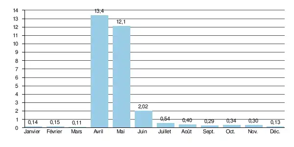 La rivière est gelée en moyenne, de la mi-novembre à la mi-avril.
