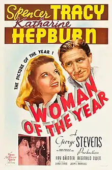 Après le succès d’Indiscrétions et une pause de quelques mois, elle reçoit un scénario de Ring Lardner Jr., Michael Kanin et Garson Kanin, La Femme de l'année. C’est la rencontre avec Spencer Tracy, celui qui va devenir l’homme de sa vie. Ils formeront un des couples les plus célèbres de l’histoire du cinéma et tourneront neuf films ensemble. Les films MGM suivants seront plus conventionnels, malgré de grands réalisateurs comme Vincente Minnelli, Elia Kazan, Clarence Brown, Frank Capra. Mais deux brillantes comédies de George Cukor, Madame porte la culotte et Mademoiselle Gagne-Tout, écrites par Ruth Gordon et Garson Kanin (nommés les deux fois aux Oscars), donnent une nouvelle preuve de la merveilleuse complicité du couple Tracy-Hepburn.