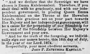 Kepelino est un fervent partisan du droit d'Emma de succéder au roi Lunalilo lors de l'élection royale de 1874 contre Kalākaua[14]. Dans les jours qui précèdent les élections, il écrit au roi d'Italie et à la reine Victoria pour demander des navires de guerre pour soutenir les revendications de la reine Emma. Ces lettres sont interceptées par Kalākaua en sa qualité de ministre des Postes[5]. À l'annonce de la victoire de Kalākaua sur Emma le , ses partisans déclenchent l'émeute du palais de justice d'Honolulu qui voit la destruction de biens gouvernementaux et l'agression de plusieurs législateurs qui votent contre la reine. Afin d'apaiser les troubles civils, les troupes américaines et britanniques débarquent avec la permission du gouvernement hawaïen et les émeutiers sont arrêtés[15]. Kepelino affirme plus tard qu'il joue un rôle dans la répression des troubles et tente de faire descendre la reine de Hānaiakamalama pour arrêter ses partisans[16]. Après l'émeute, Kepelino continue à soutenir politiquement son employeur et le Parti Reine Emma qui s'est formé pour s'opposer au nouveau roi. À l'été 1874, il lance une pétition auprès du commissaire français Théo Ballieu, demandant l'intervention française pour détrôner Kalākaua [17],[18]. La pétition, datée du 14 juillet et signée sous le nom de « John P. Zephyrina Kahoalii », affirme que « D. Kalakaua n'est pas le roi légitime. C'est pourquoi nous pleurons la paix brisée et la perte de notre indépendance. Le faux roi fait ce qui détruira notre indépendance et provoquera de grands troubles dans le futur. Car ce faux roi (D. Kalakaua) est très désireux d'hypothéquer le gouvernement auprès d'un gouvernement étranger pour un million de dollars » [19] [20].