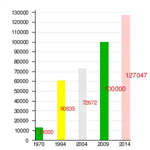 La langue parlée est Tazayit[19], une variante de la langue tamazight, un parler du Maroc central aussi l'arabe dialectale (Darija), langue parlée localement et au Maroc. La démographie s'est développée considérablement : à partir des années 1970, la ville avait encore environ 13 000 habitants. Au recensement de 1994, la population était de 60 835 habitants. Pour le recensement de 2004, Khénifra comptait 72 672 habitants.