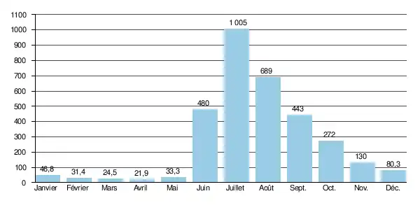Les eaux de la rivière sont stockées dans le lac de retenue lors des crues de printemps; puis sont relâchées l'hiver suivant, dans le but de produire un maximum d'énergie lorsque l'on en a le plus besoin, en hiver. De ce fait les débits observés ne traduisent plus le rythme saisonnier naturel. Le graphique suivant a donc un but purement illustratif.