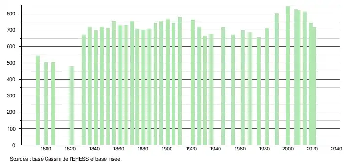 L'évolution du nombre d'habitants est connue à travers les recensements de la population effectués dans la commune depuis 1793. Pour les communes de moins de 10 000 habitants, une enquête de recensement portant sur toute la population est réalisée tous les cinq ans, les populations légales des années intermédiaires étant quant à elles estimées par interpolation ou extrapolation[23]. Pour la commune, le premier recensement exhaustif entrant dans le cadre du nouveau dispositif a été réalisé en 2008[24].