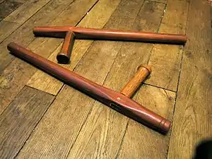 - Le tonfa, une arme de bois qui s'utilise par paire et qui servait, à l'origine, à tourner les meules pour moudre les céréales.