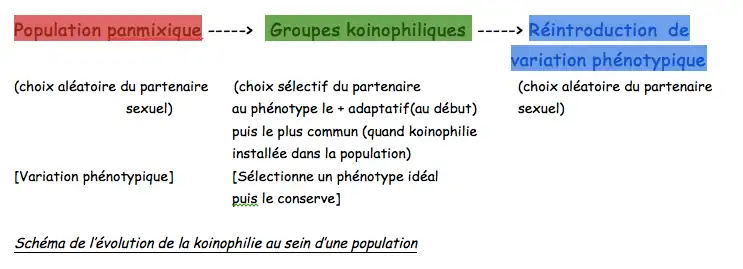 Une population panmixique peut donc évoluer en population koinophilique, comme l’illustre le schéma, ci-dessous.