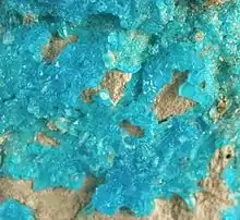 échantillon de kröhnkite de taille centimétrique montrant un unique cristal bleu-vert au centre, mine de Chuquicamata, Chili | |