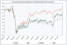 Entre son pic de 6.111,24 points du et la clôture de lundi 09 , à 4.707,91 points, le CAC 40 a perdu 22.9 %, ce qui efface les hausses de l'année 2019[13].