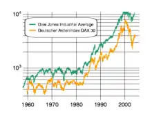 - le doublement de l'endettement global depuis la fin des années 1970, endettement matérialisé par l'afflux énorme de liquidité. L'indice du Dow Jones triple en dix ans.