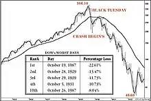 En comparaison, lors du krach du 29 octobre 1929, la valeur du Dow Jones avait chuté de -12,6%, alors que le 19 octobre 1987, le Dow Jones chute de -22,6% (-500 points)[3].