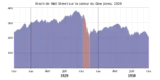 Le krach de 1929 est une crise boursière qui se déroula à la Bourse de New York entre le jeudi et le mardi . Cet événement est l'un des plus célèbres de l'histoire boursière, marquant le début de la Grande Dépression, la plus grande crise économique de l'Histoire. Les jours-clés du krach ont hérité de surnoms distincts : le est appelé « jeudi noir », le est le « lundi noir », et le est le « mardi noir », dates-clés de l'histoire boursière. Conséquence directe, aux États-Unis, le chômage et la pauvreté explosent pendant la Grande Dépression et poussent quelques années plus tard à une réforme agressive des marchés financiers[1].
