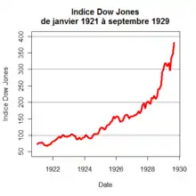 Ainsi, de 1921 à 1929, le monde semble installé dans une période de prospérité. Après des années de tensions politiques entre grandes nations à la suite du règlement difficile de la Première Guerre mondiale, la paix paraît rétablie durablement[8]. La production industrielle augmente de 50 %. Le « boom » boursier n'apparaît donc pas ex nihilo. Mais il est trop rapide : la hausse annuelle des cours pendant la même période est de 18 %, soit une hausse totale de plus de 300 %. Selon l'économiste Jacques Brasseul, « le cours des titres augmente plus que les profits des entreprises, qui eux-mêmes augmentent plus que la production, la productivité, et enfin plus que les salaires, bons derniers dans cette course ». Un élément spéculatif se développe, puis devient prépondérant à partir de 1928, date où le cabinet Charles Merrill (aujourd'hui Merrill Lynch) recommande de ne plus s'endetter davantage pour acheter des actions, et indique : « Sans que cela constitue une recommandation de vente, le moment est opportun pour se libérer de ses crédits ». Ce ne sont en effet plus les dividendes qui attirent les investisseurs, mais la possibilité de revendre avec une importante plus-value ; beaucoup de titres sont achetés à crédit à cette fin.