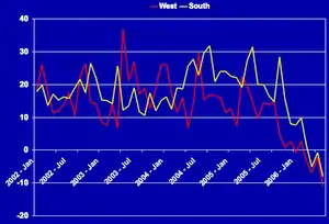 Variation du prix des appartements en % dans le Sud et l'Ouest des États-Unis durant la période 2002-2006 (source: NAR.) - This article classified several U.S. real-estate regions as "Dead Zones", "Danger Zones", and "Safe Havens."