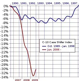 - (en) Robert Shiller, « The Bubble's New Home », Barron's Magazine, (lire en ligne) — The home-price bubble feels like the stock-market mania in the spring of 1999, just before the stock bubble burst in early 2000, with all the hype, herd investing and absolute confidence in the inevitability of continuing price appreciation. My blood ran slightly cold at a cocktail party the other night when a recent Yale Medical School graduate told me that she was buying a condo to live in Boston during her year-long internship, so that she could flip it for a profit next year. Tulipmania reigns. Plot of inflation-adjusted home price appreciation in several U.S. cities, 1990–2005: